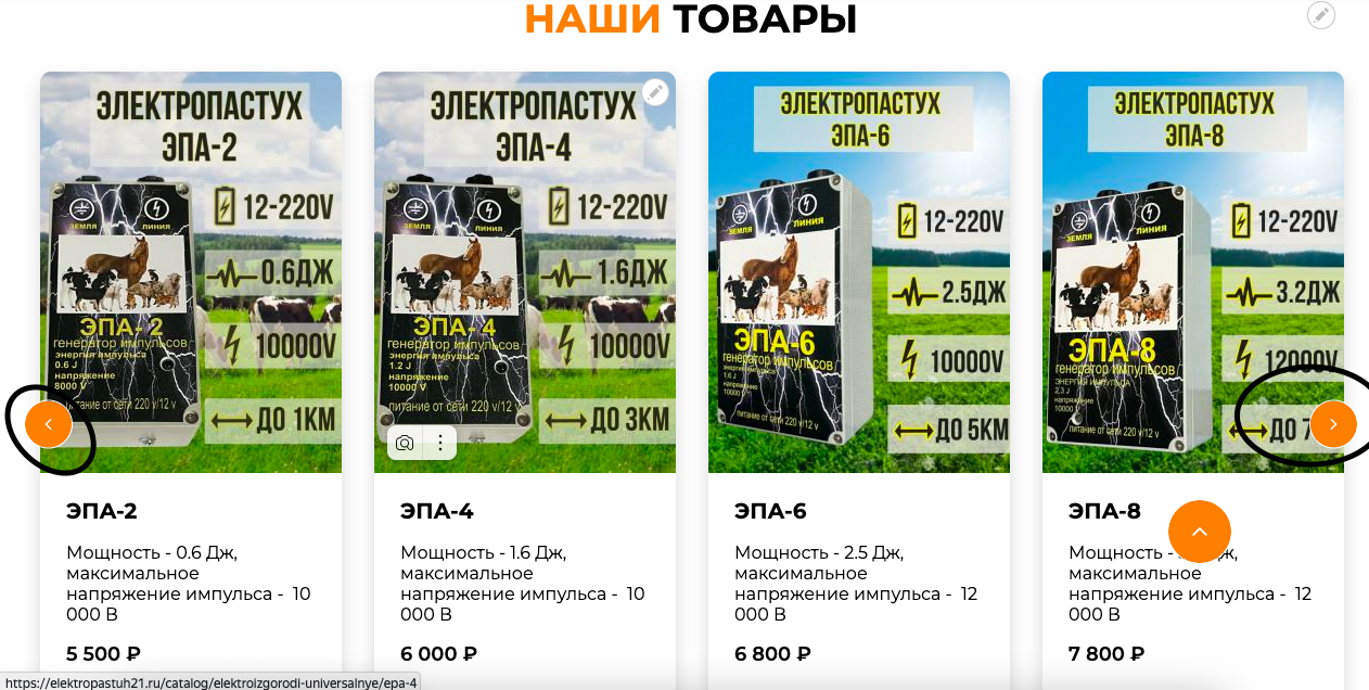 - Далее колесиком мыши крутя вниз, вы увидите раздел товаров, где можете просмотреть весь наш каталог товаров, так же стрелками "влево" и "вправо" мы можем увидеть весь каталог, подробнее на фото: